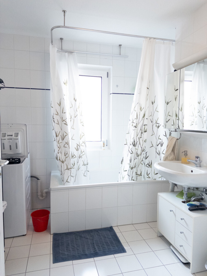 - 1 Tageslicht-Badezimmer mit Badewanne, Waschtisch, WC und Anschluss für die Waschmaschine